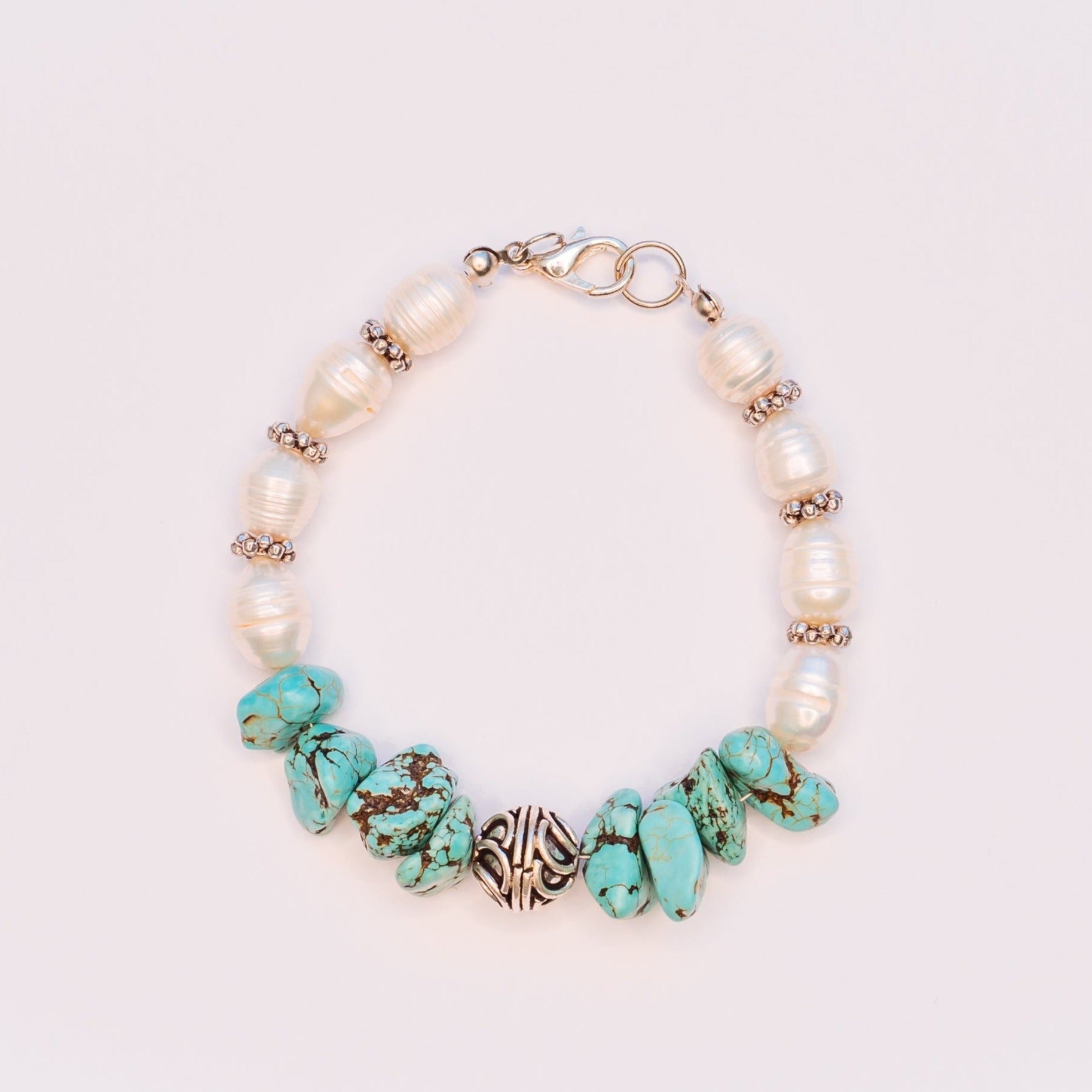 Această brățară unică este realizată manual cu pietre turcoaz neregulate, perle luminoase de cultură și distanțiere din metal de calitate. Combinarea acestor elemente creează o bijuterie sofisticată și rafinată, cu o textură interesantă și o paletă de culori deosebite. Această brățară lucrată manual este o alegere excelentă pentru femeile care caută o bijuterie unică și elegantă, care să completeze cu stil ținutele lor preferate.