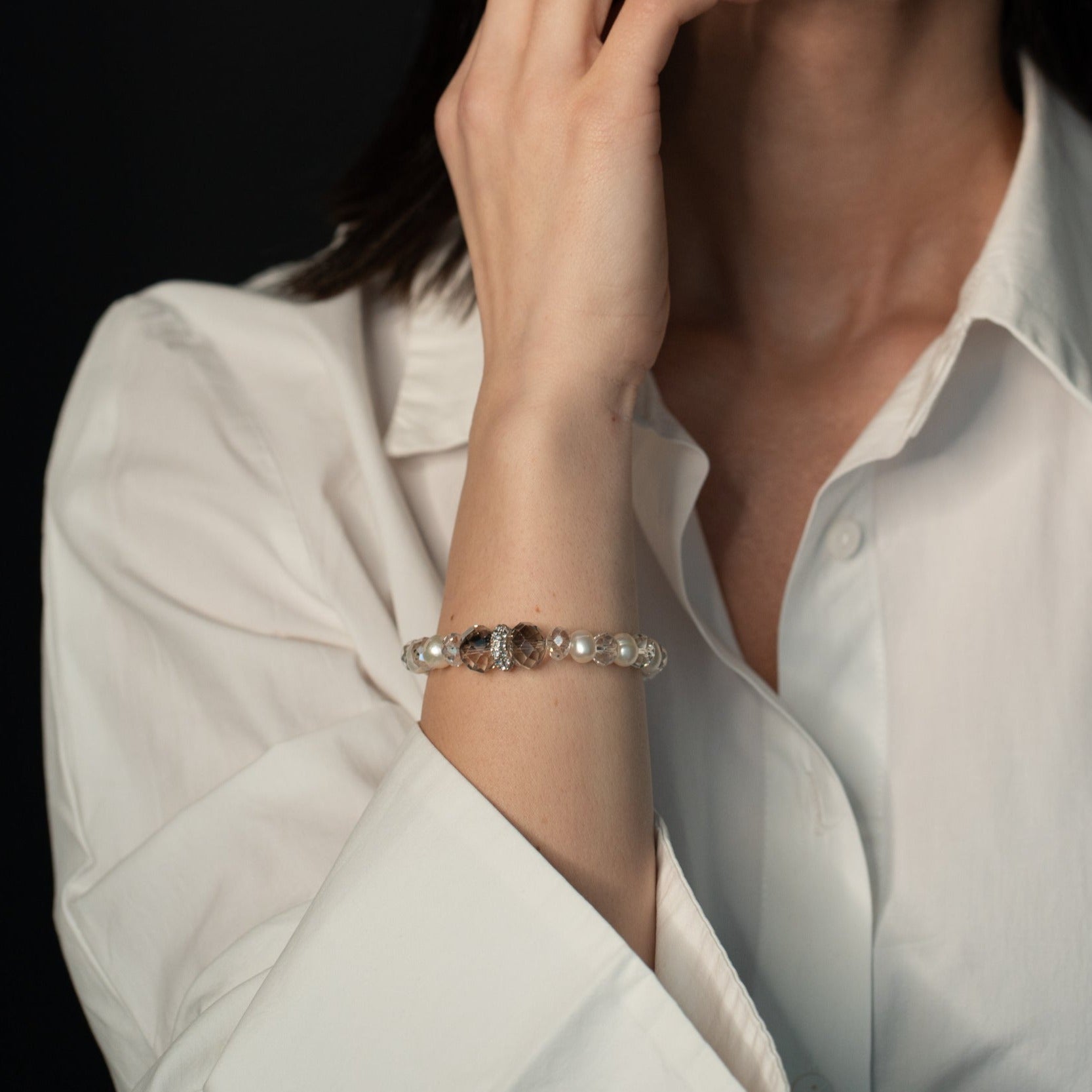 Această brățară unică este realizată manual cu cristale swarowski, perle de cultură, distanțiere din metal de calitate si distantiere cu cristale swarowski.