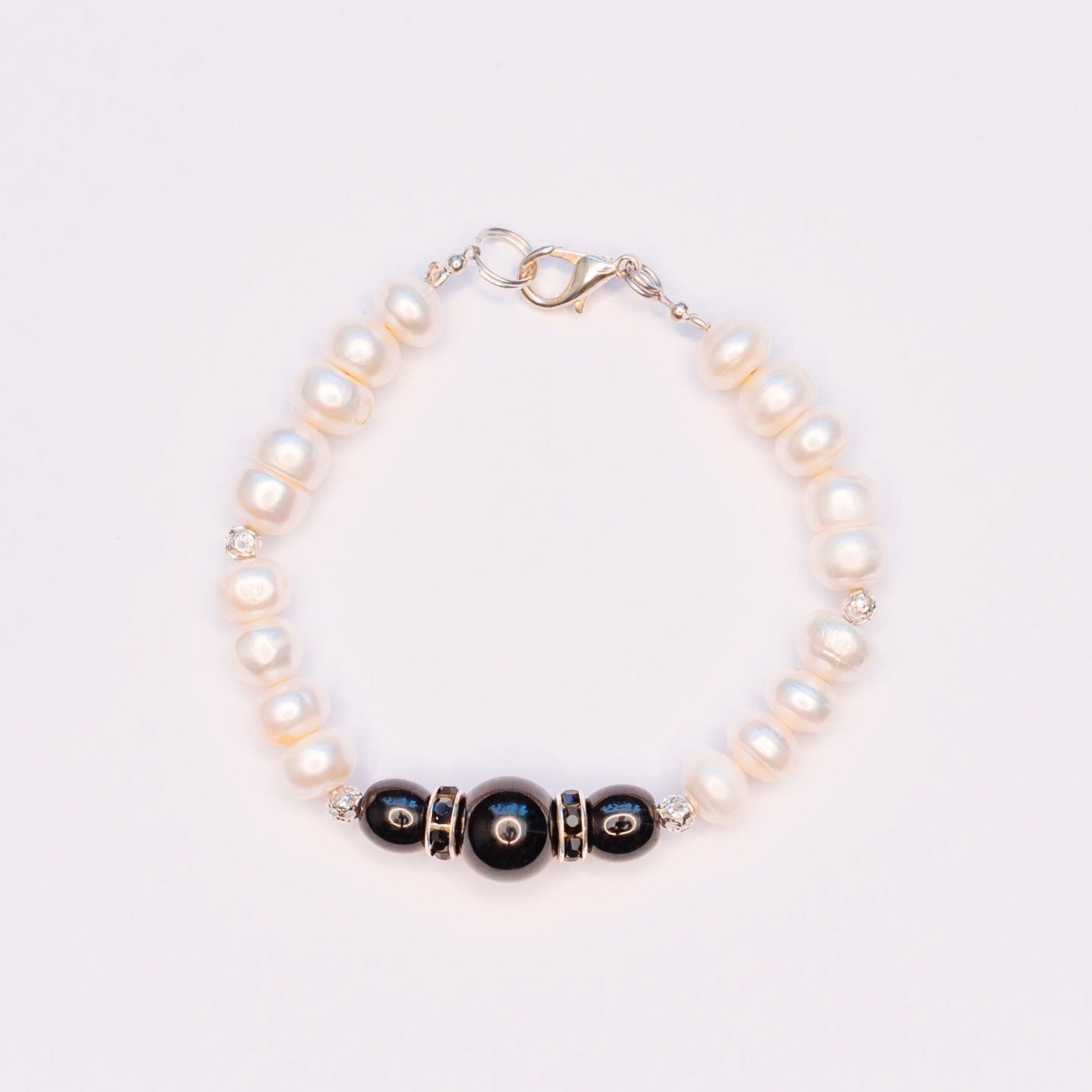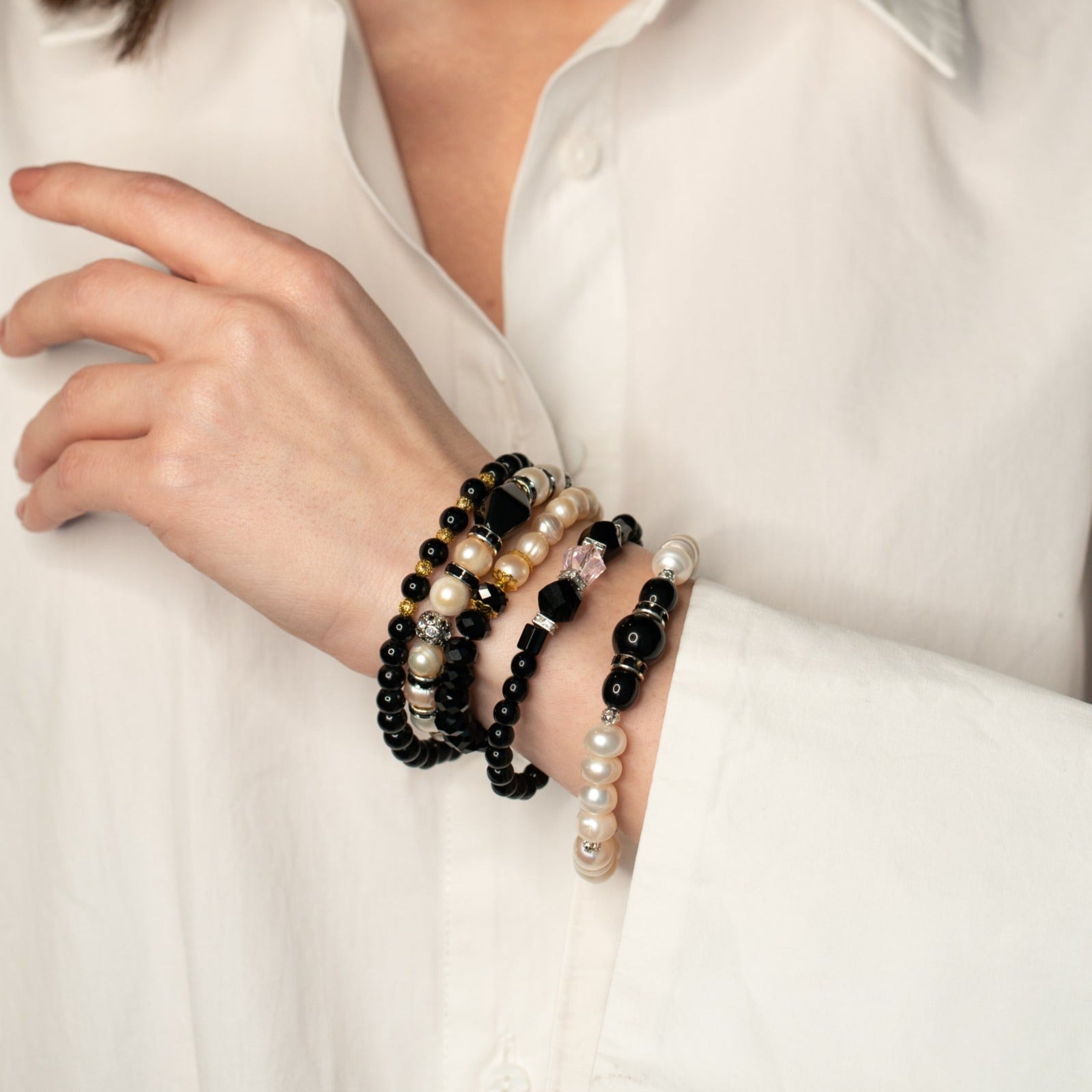 Această brățară unică este realizată manual cu pietre onix, perle de cultură și distanțiere rhinestone din metal de calitate. Combinarea acestor elemente creează o bijuterie sofisticată și rafinată, cu o textură interesantă și o paletă de culori deosebite. Această brățară lucrată manual este o alegere excelentă pentru femeile care caută o bijuterie unică și elegantă, care să completeze cu stil ținutele lor preferate.