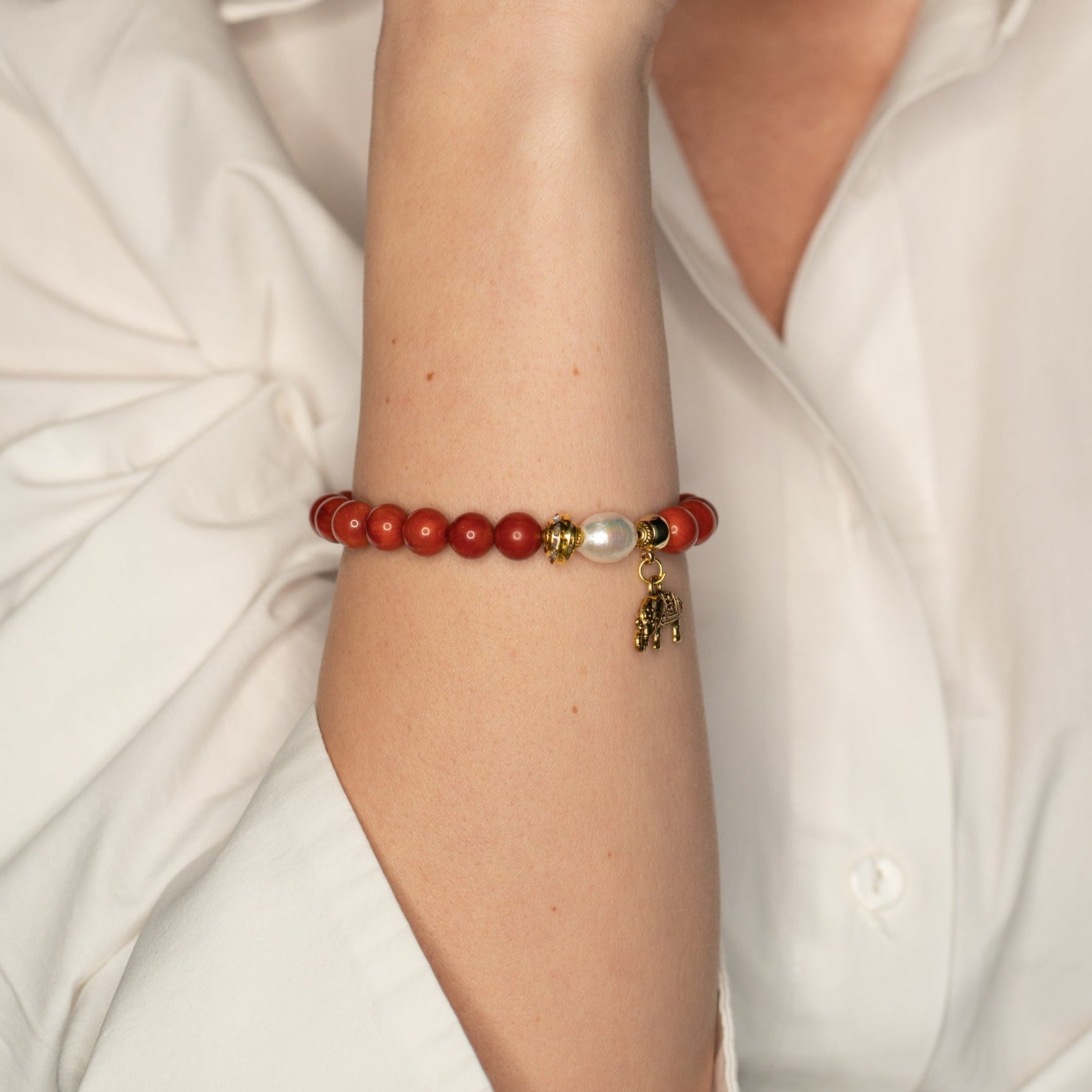 Această brățară unică este realizată manual cu perle de cultură, coral roșu și distanțiere din metal auriu de calitate. Combinarea acestor elemente creează o bijuterie sofisticată și rafinată, cu o textură interesantă și o paletă de culori deosebite. Această brățară lucrată manual este o alegere excelentă pentru femeile care caută o bijuterie unică și elegantă, care să completeze cu stil ținutele lor preferate.