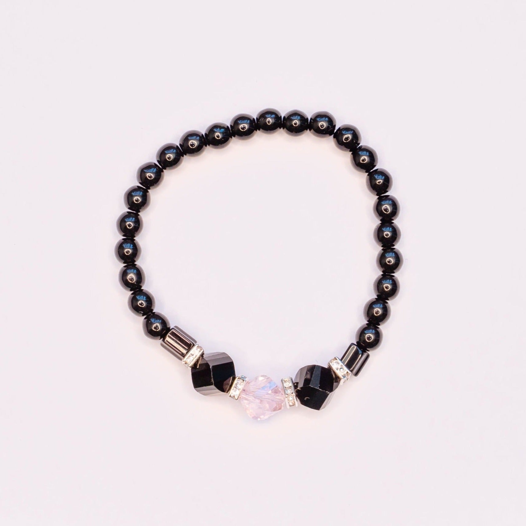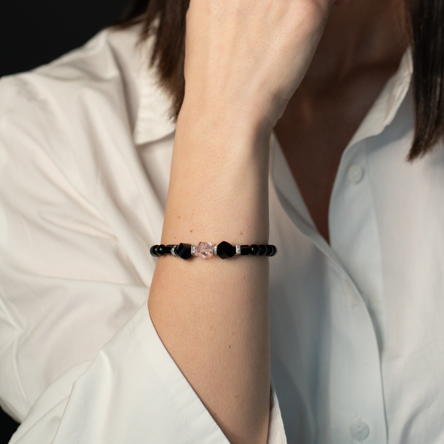 Această brățară unică este realizată manual cu pietre onix, cristale swarowski și distanțiere rhinestone din metal de calitate. Combinarea acestor elemente creează o bijuterie sofisticată și rafinată, cu o textură interesantă și o paletă de culori deosebite. Această brățară lucrată manual este o alegere excelentă pentru femeile care caută o bijuterie unică și elegantă, care să completeze cu stil ținutele lor preferate.