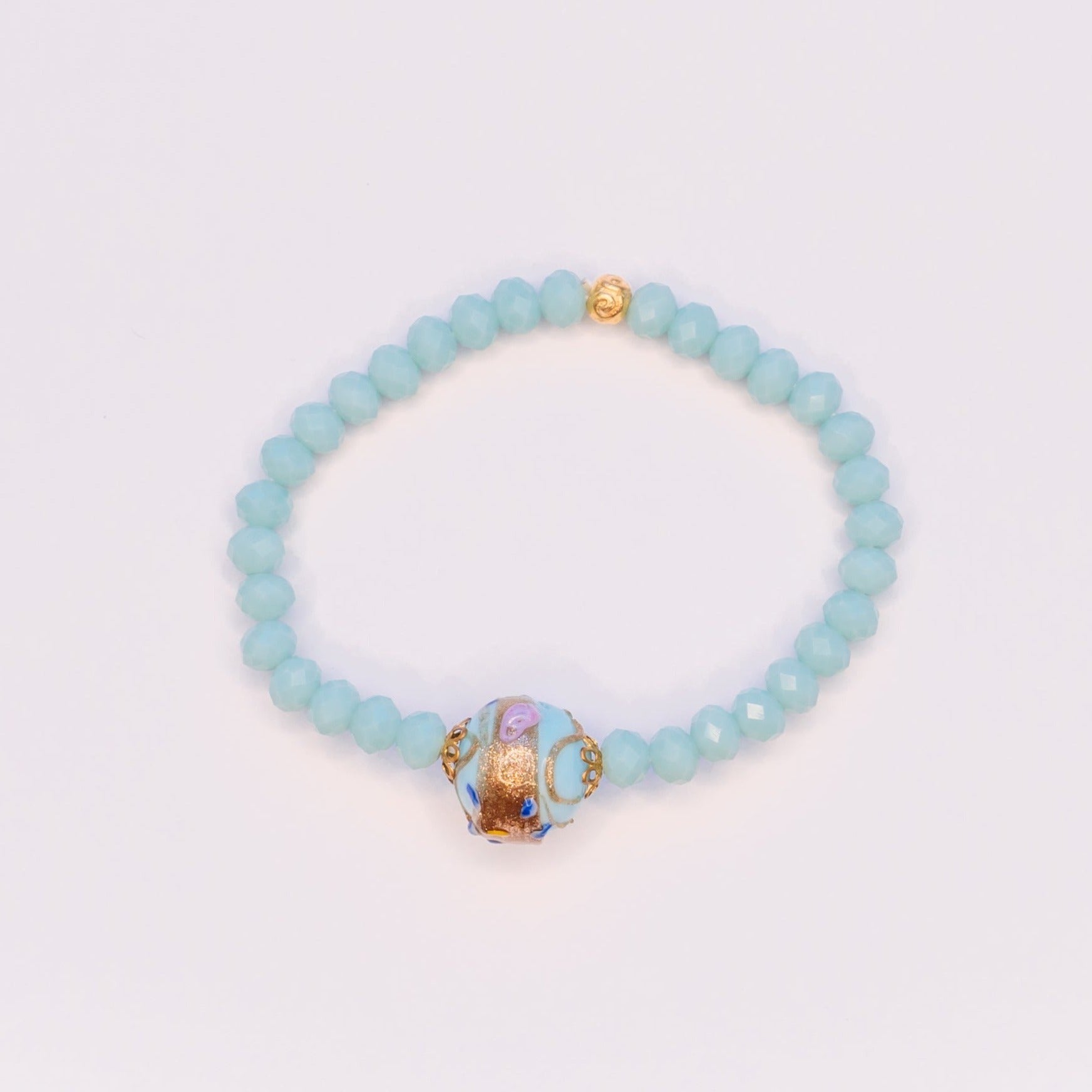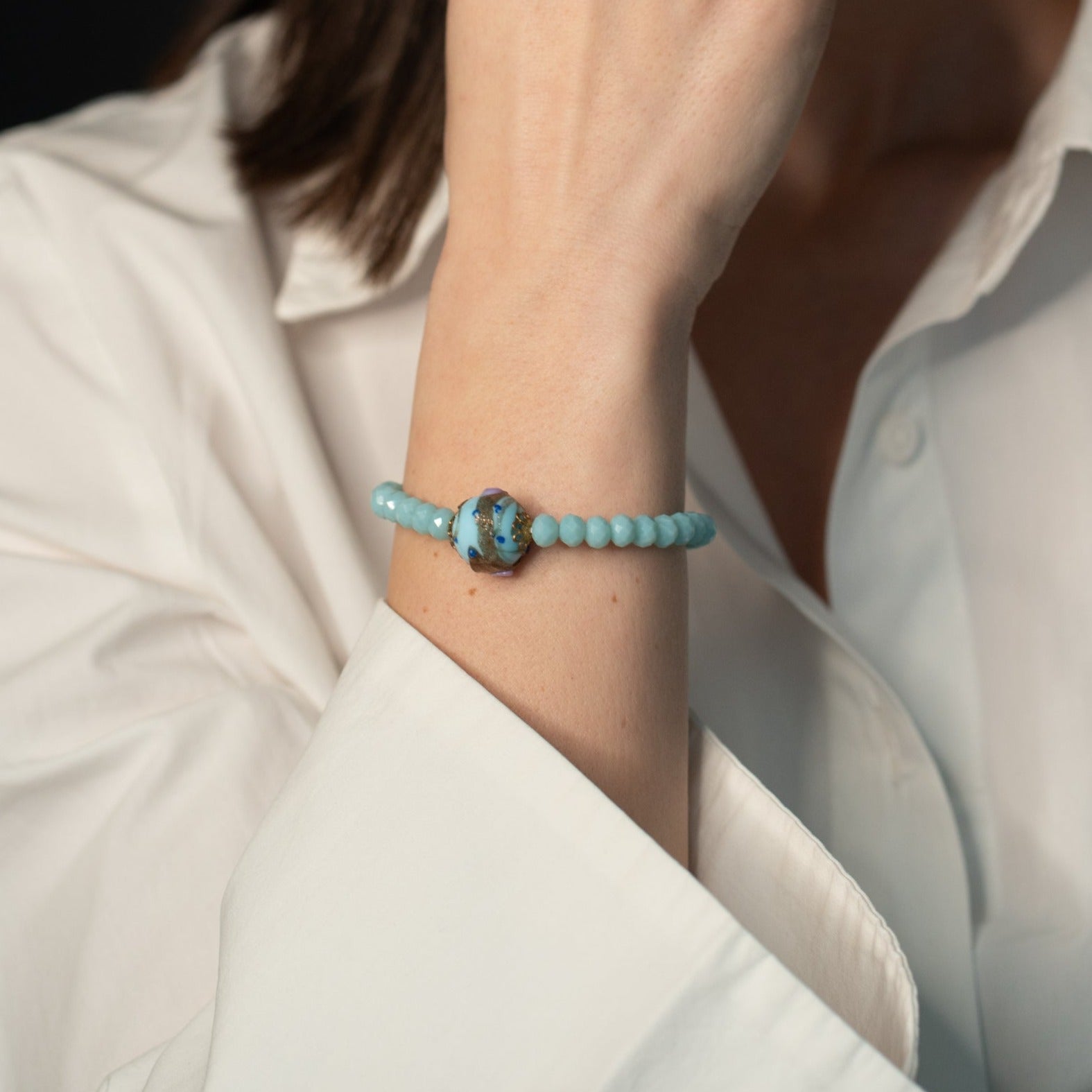 Această brățară unică este realizată manual cu o piatră deosebită cloisoneé, cristale fațetate bleu și distanțiere din metal de calitate cu ștrasuri. Combinarea acestor elemente creează o bijuterie sofisticată și rafinată, cu o textură interesantă și o paletă de culori deosebite. Această brățară lucrată manual este o alegere excelentă pentru femeile care caută o bijuterie unică și elegantă, care să completeze cu stil ținutele lor preferate.