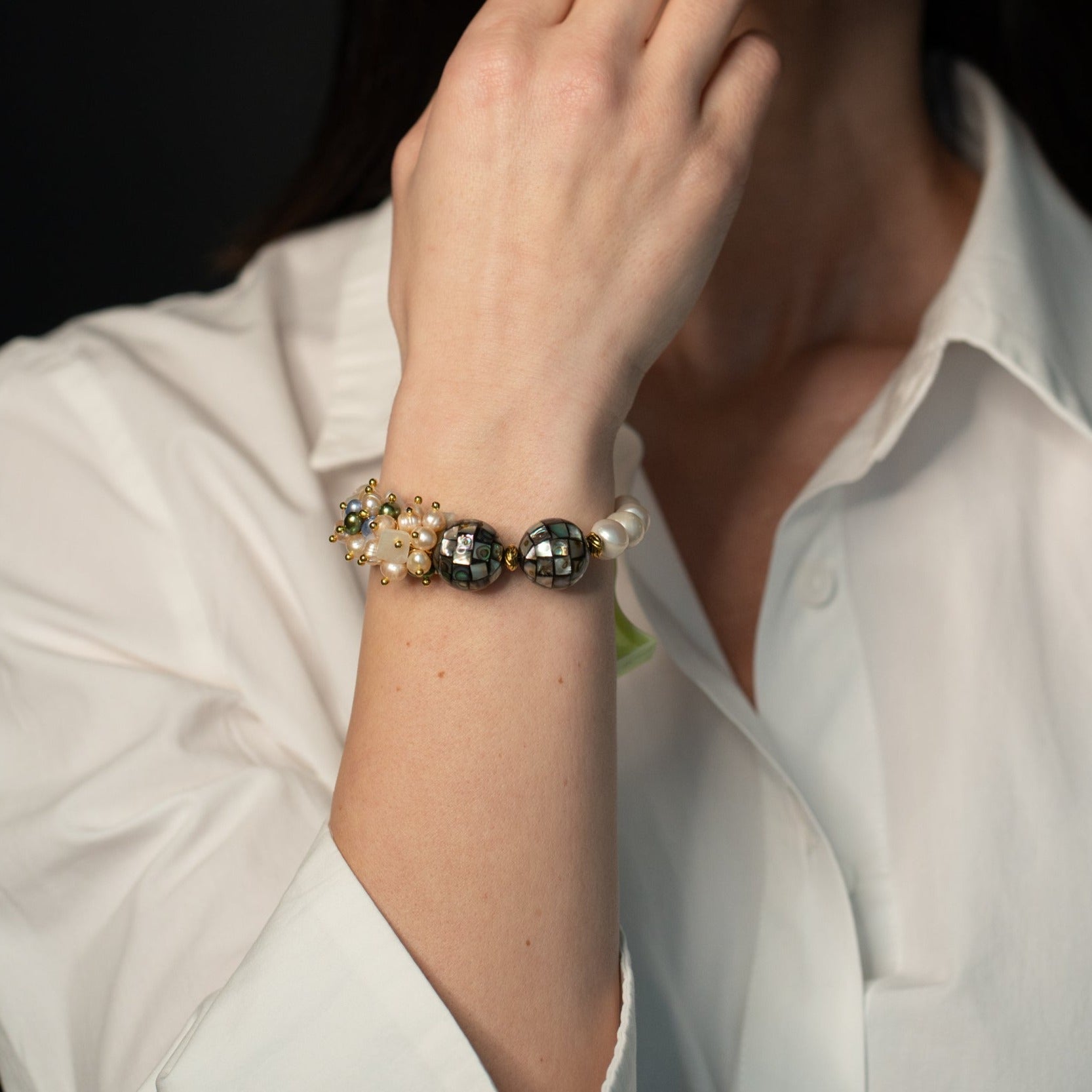 Această brățară unică este realizată manual cu perle albastre, verzi și perle de cultură, bile de sidef abalone și distanțiere din metal aurit de calitate. Combinarea acestor elemente creează o bijuterie sofisticată și rafinată, cu o textură interesantă și o paletă de culori deosebite. Această brățară lucrată manual este o alegere excelentă pentru femeile care caută o bijuterie unică și elegantă, care să completeze cu stil ținutele lor preferate.