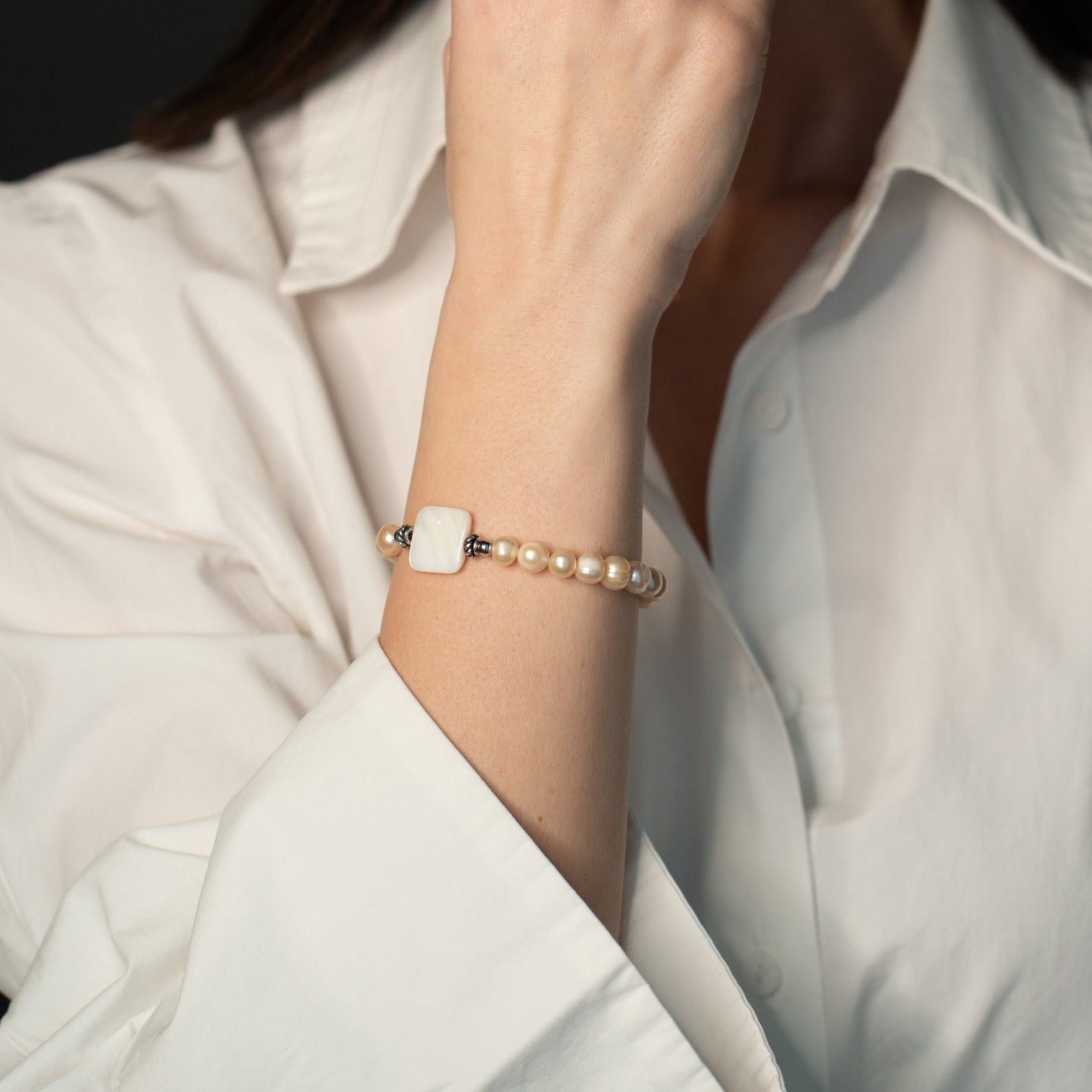 Această brățară unică este realizată manual cu perle de cultură, perlă de sidef și distanțiere din metal de calitate. Combinarea acestor elemente creează o bijuterie sofisticată și rafinată, cu o textură interesantă și o paletă de culori deosebite. Această brățară lucrată manual este o alegere excelentă pentru femeile care caută o bijuterie unică și elegantă, care să completeze cu stil ținutele lor preferate.