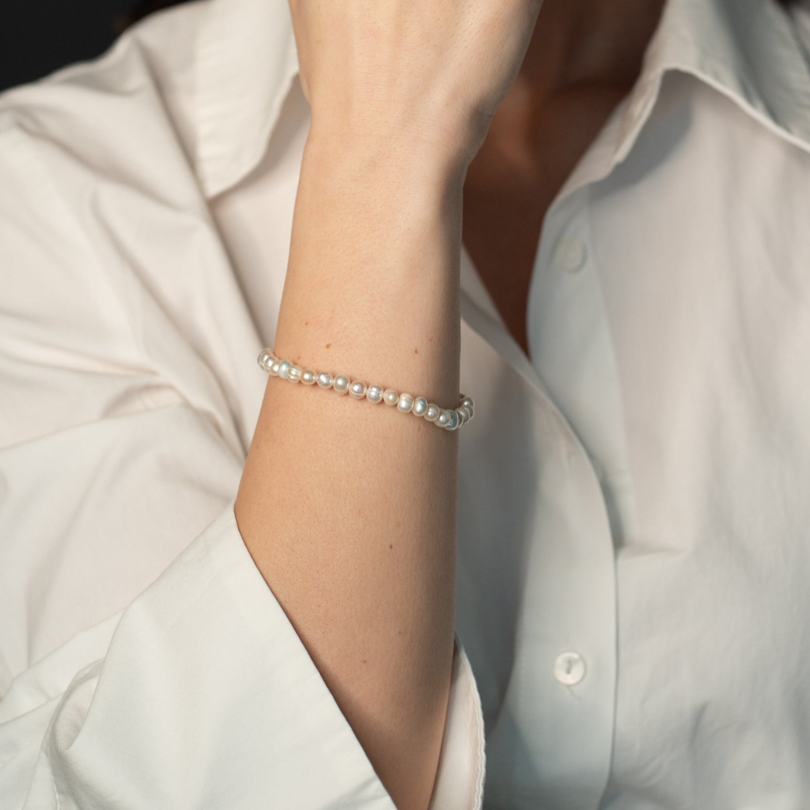 Această brățară unică este realizată manual cu perle albe de cultură 4mm și distanțiere din metal de calitate. Combinarea acestor elemente creează o bijuterie sofisticată și rafinată, cu o textură interesantă și o paletă de culori deosebite. Această brățară lucrată manual este o alegere excelentă pentru femeile care caută o bijuterie unică și elegantă, care să completeze cu stil ținutele lor preferate.