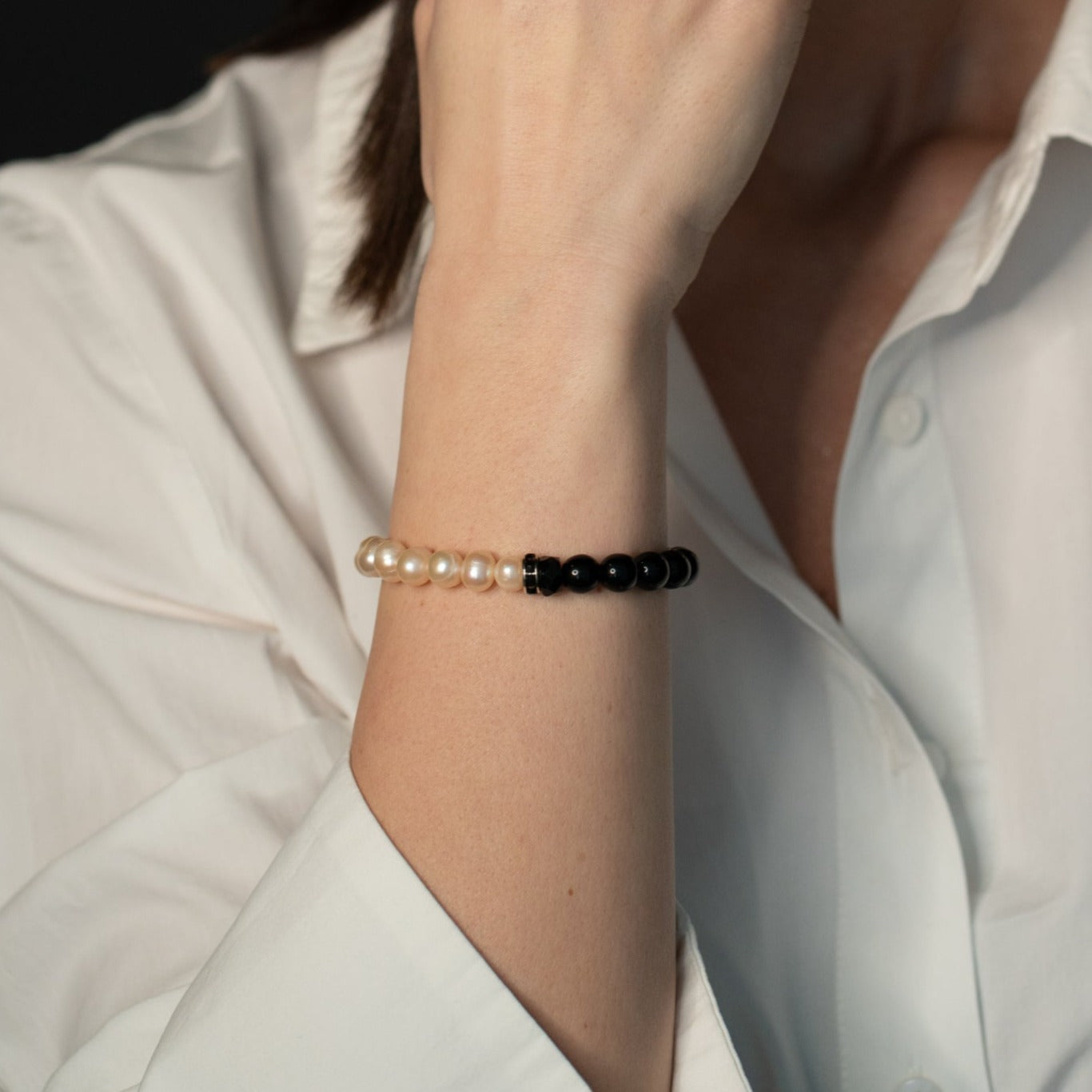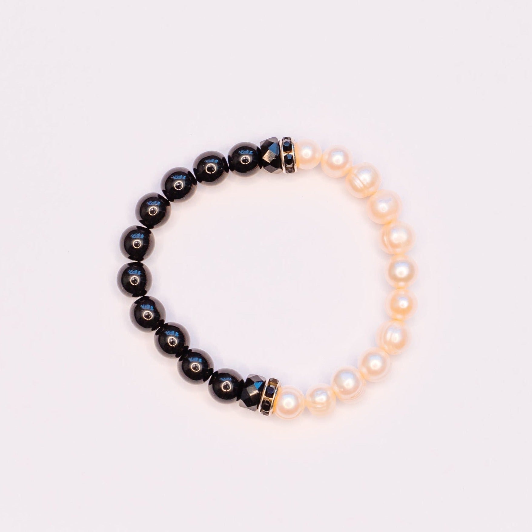 Această brățară unică este realizată manual cu pietre onix, perle de cultură și distanțiere rhinestone din metal de calitate cu ștrasuri. Combinarea acestor elemente creează o bijuterie sofisticată și rafinată, cu o textură interesantă și o paletă de culori deosebite. Această brățară lucrată manual este o alegere excelentă pentru femeile care caută o bijuterie unică și elegantă, care să completeze cu stil ținutele lor preferate.