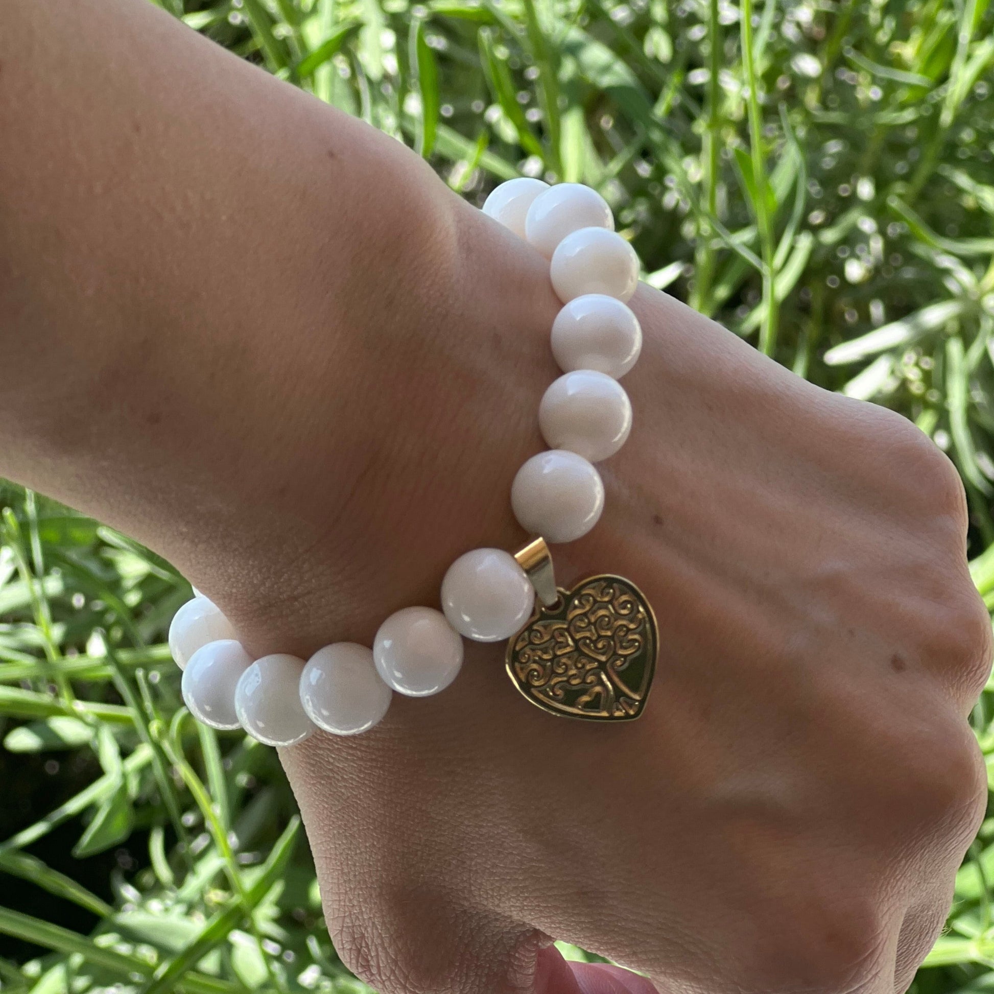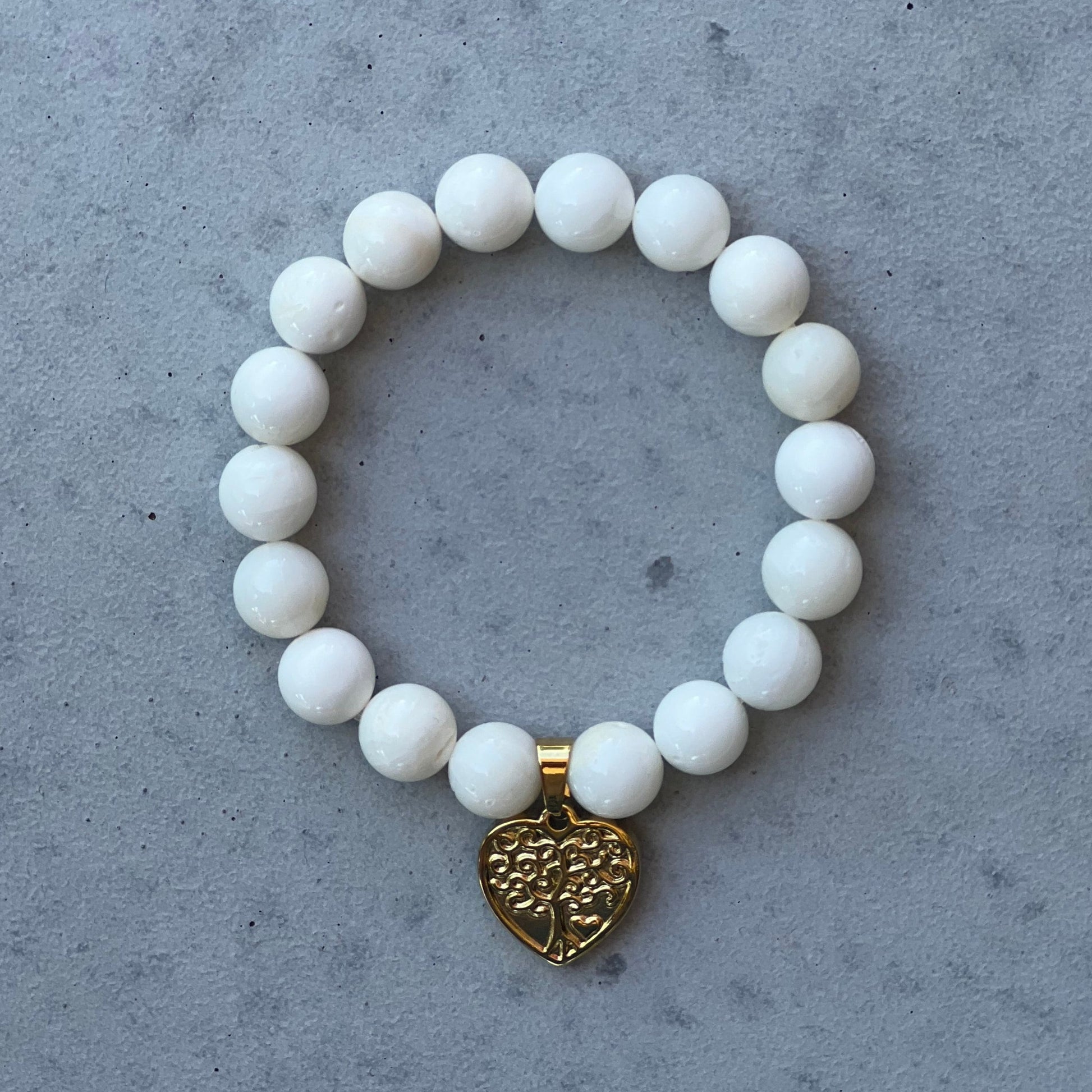 Material: piatră coral alb 10 mm, elastic, aliaje usoare (zinc, alamă, otel)