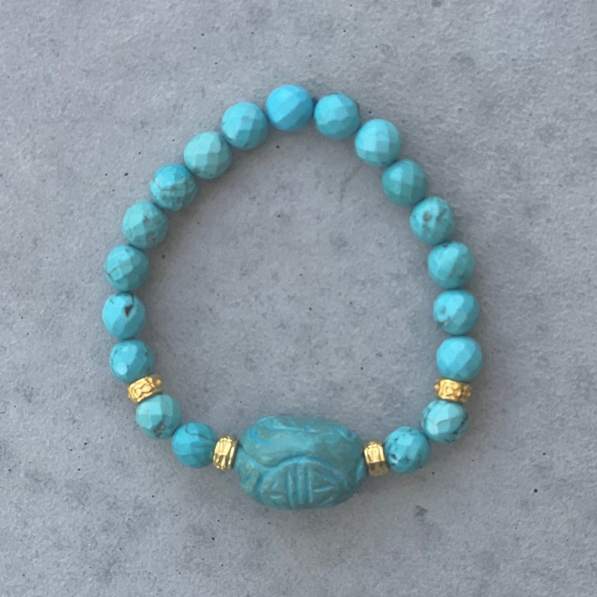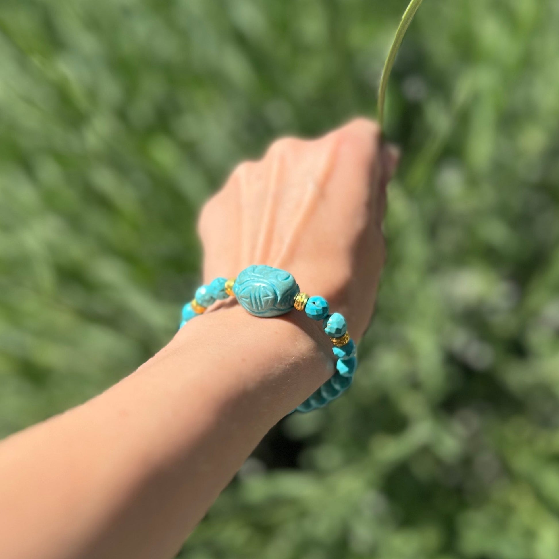 Această brățară unică este realizată manual cu pietre de turcoaz fațetate, o piatra din coral sculptat și distanțiere din metal aurit de calitate. Combinarea acestor elemente creează o bijuterie sofisticată și rafinată, cu o textură interesantă și o paletă de culori deosebite. Această brățară lucrată manual este o alegere excelentă pentru femeile care caută o bijuterie unică și elegantă, care să completeze cu stil ținutele lor preferate.