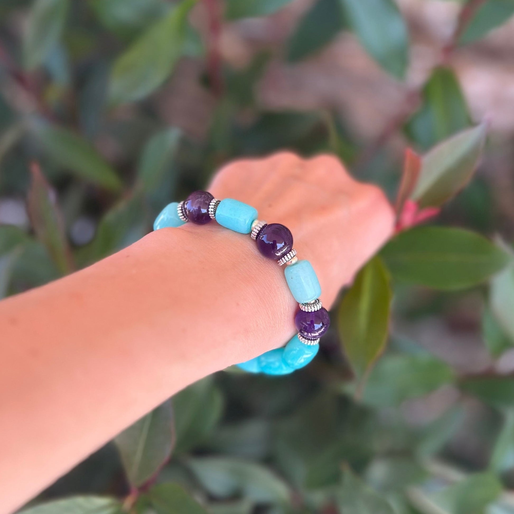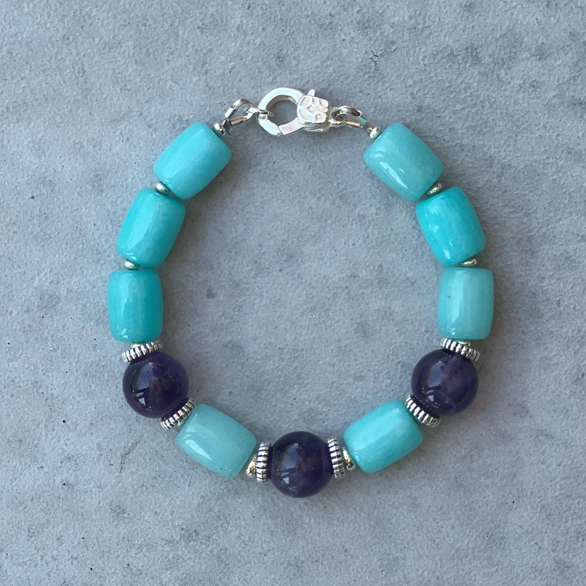 Material: pietre amestist si jad albastru 8mm, elastic, accesorii aliaje usoare (placate cu argint 925)