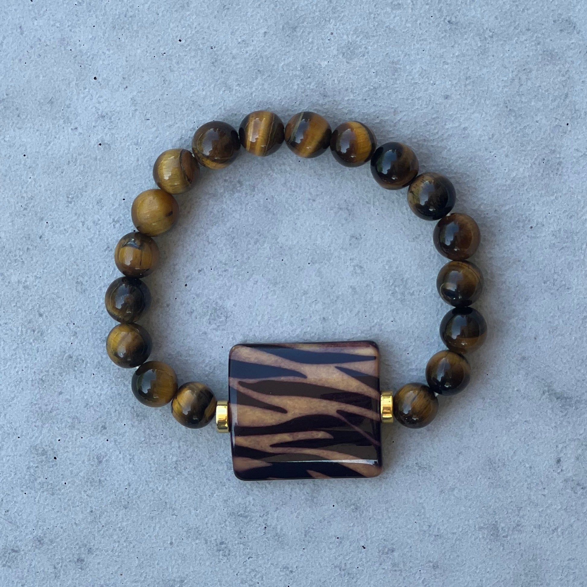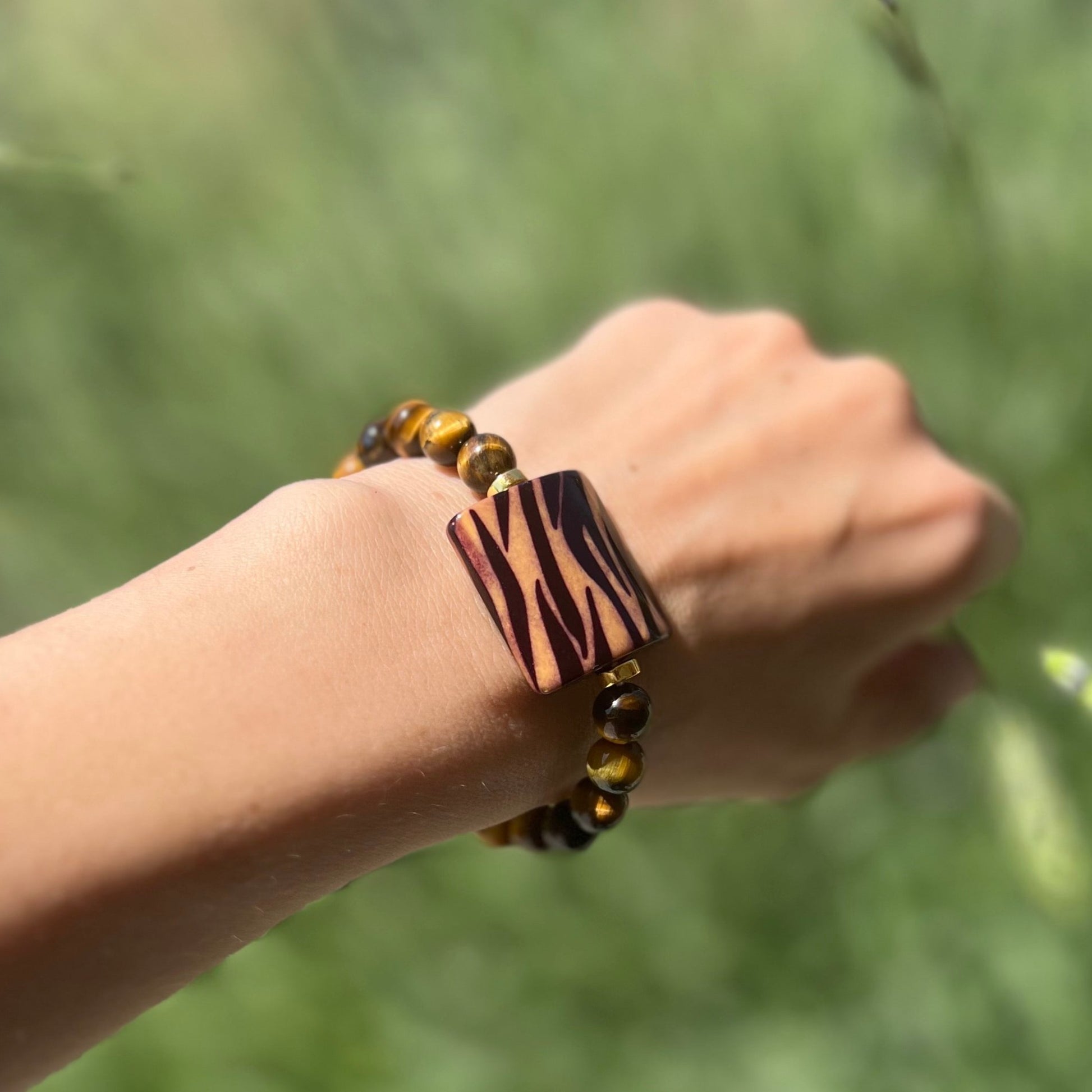 Material: pietre jasp mocait 8 mm, piatră ornament animal print, elastic, aliaje usoare (zinc, alamă, otel)
