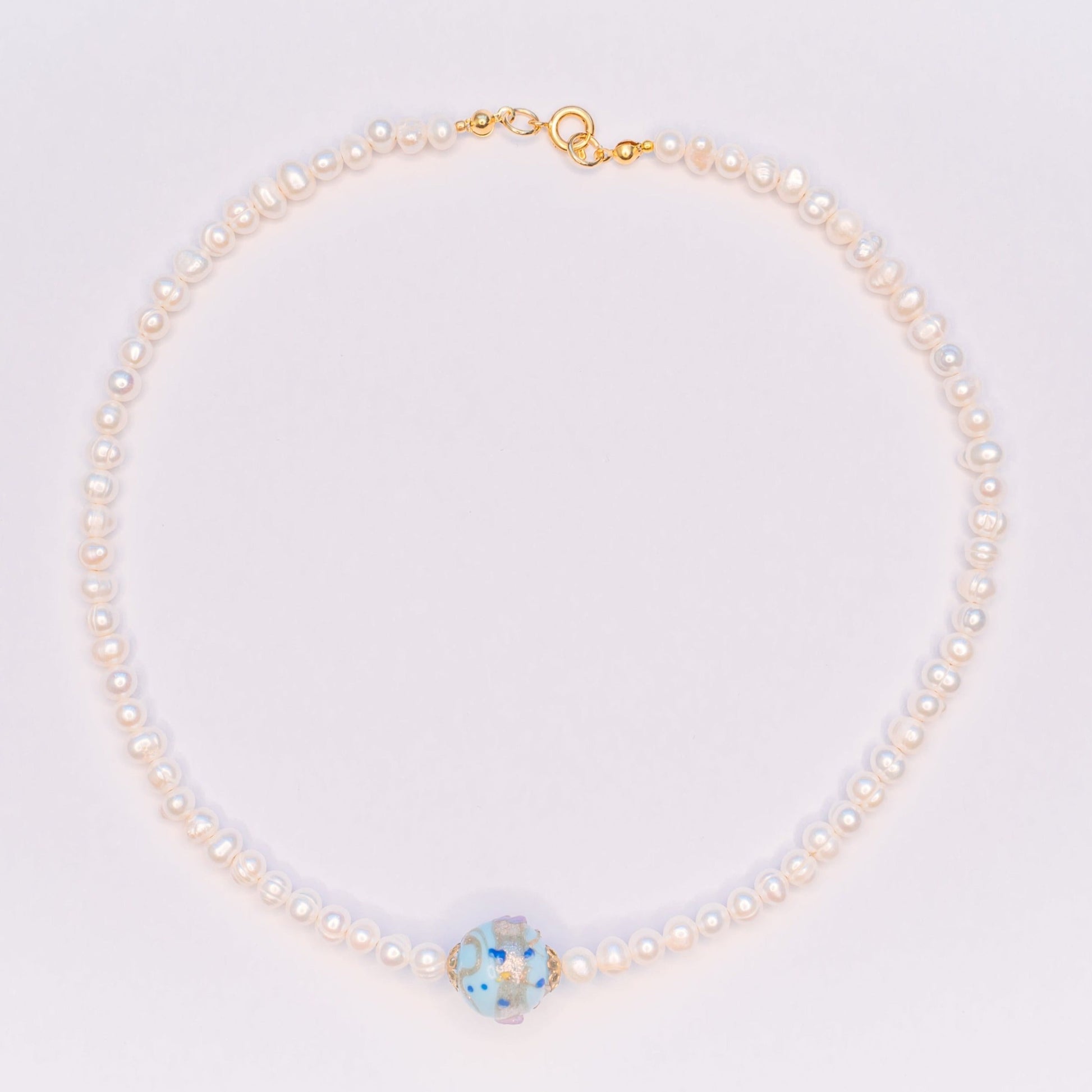 Acest colier lucrat manual este o bijuterie sofisticată și unică, creată cu un șirag de perle de cultură și o margea cloisonné. Margeaua cloisonné adaugă un efect frumos de culoare și textură, în timp ce perlele de cultură adaugă o eleganță clasică. Bijuteria este perfectă pentru a completa un look elegant și este potrivită pentru orice ocazie specială.
