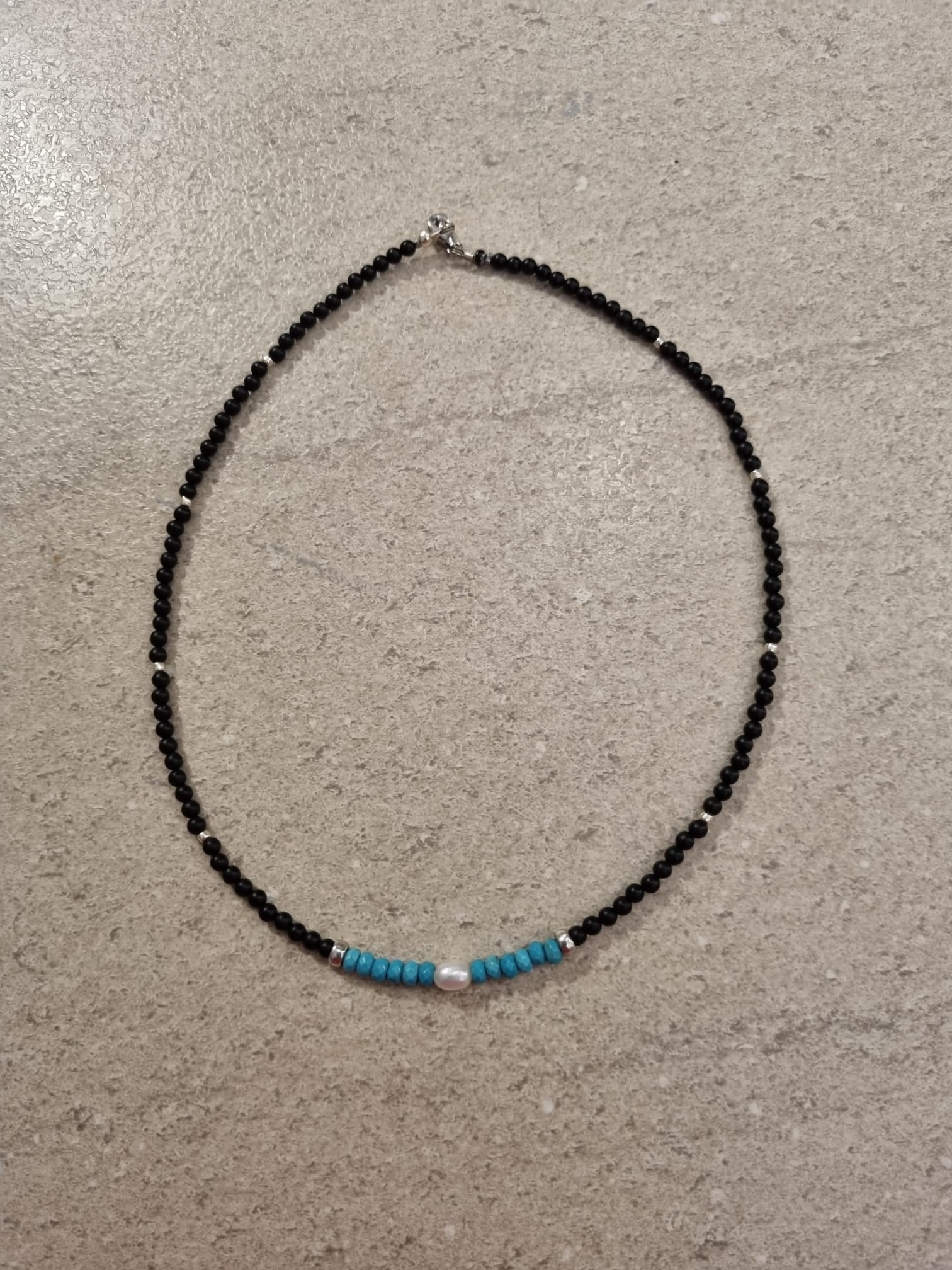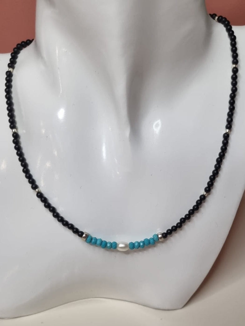 Acest colier lucrat manual este realizat din pietre de onix perlă de cultură si rondele de magnezit .