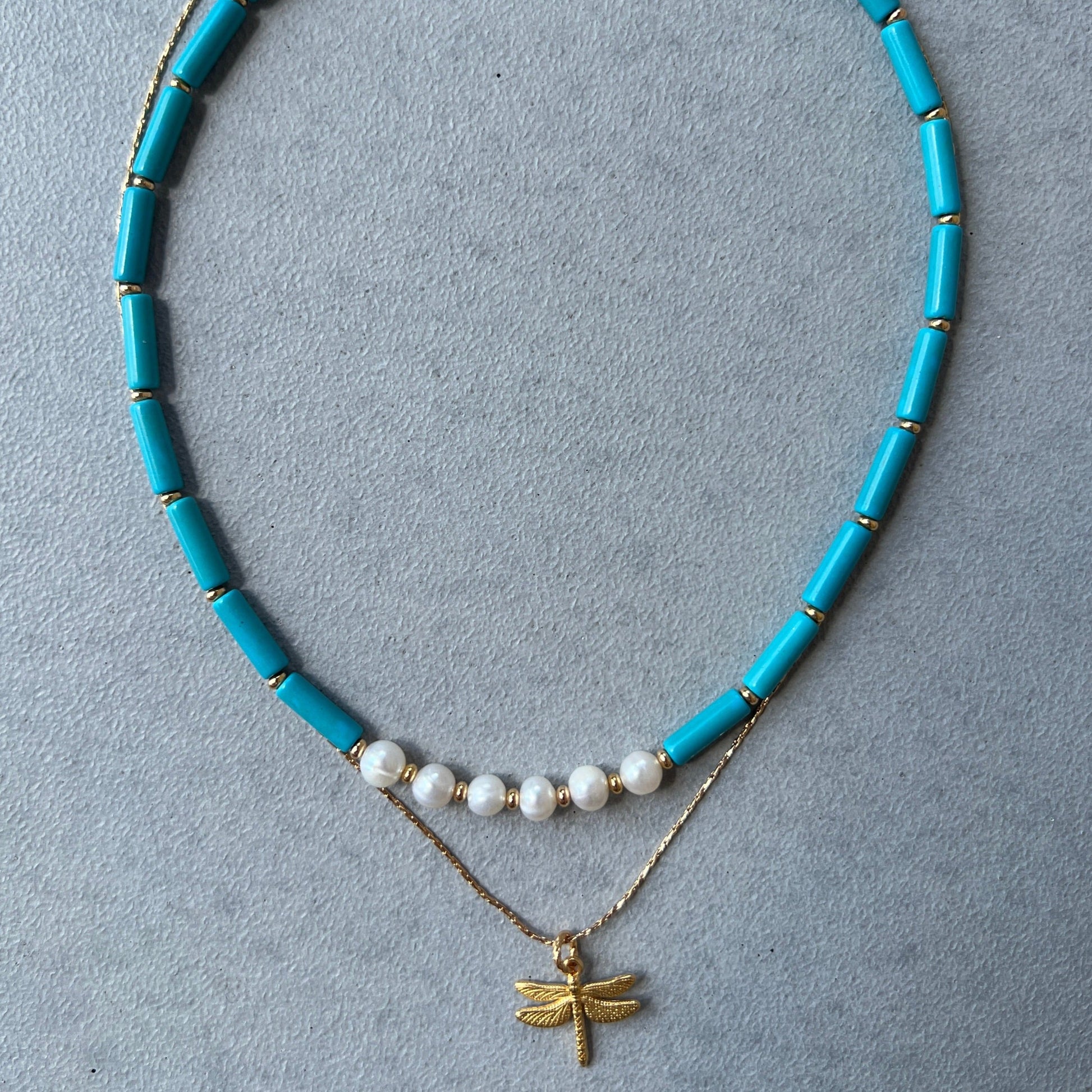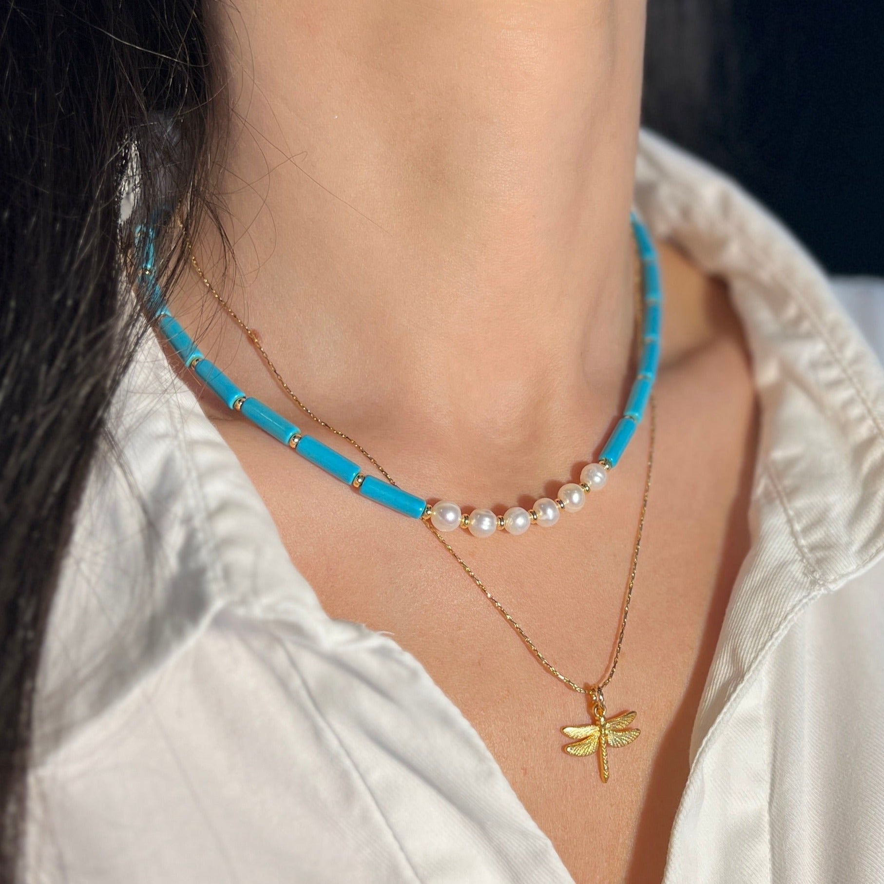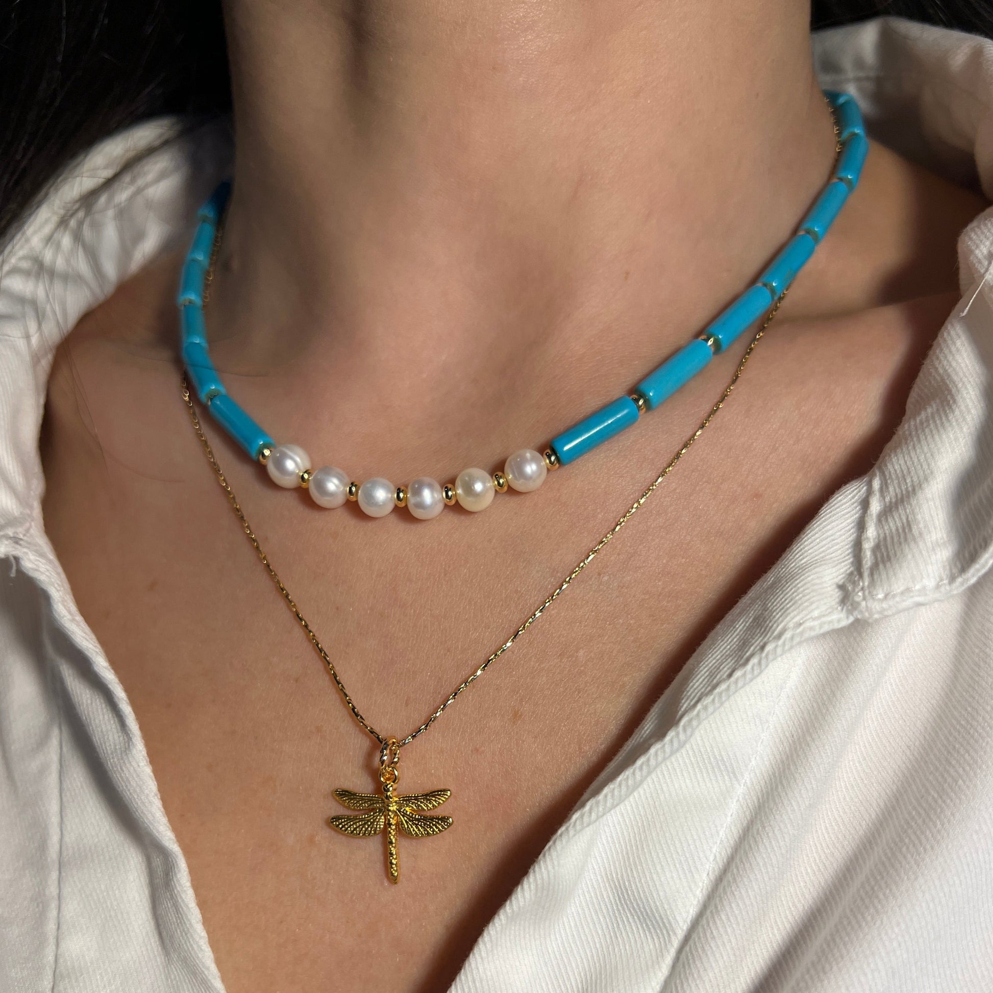 Acest colier format din perle de cultură și sfere de turcoaz este o alegere elegantă pentru a-ți completa orice ținută. Colierul conține și un lanțișor cu un fermecător pandantiv în formă de fluture de culoare aurie.