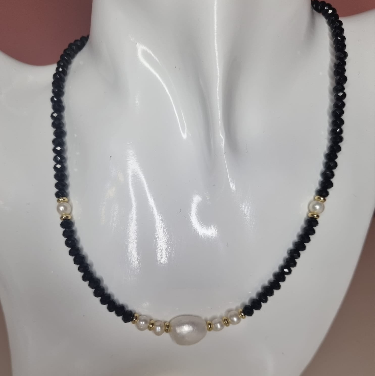 Acest colier lucrat manual este realizat din pietre de onix și perle de cultură.