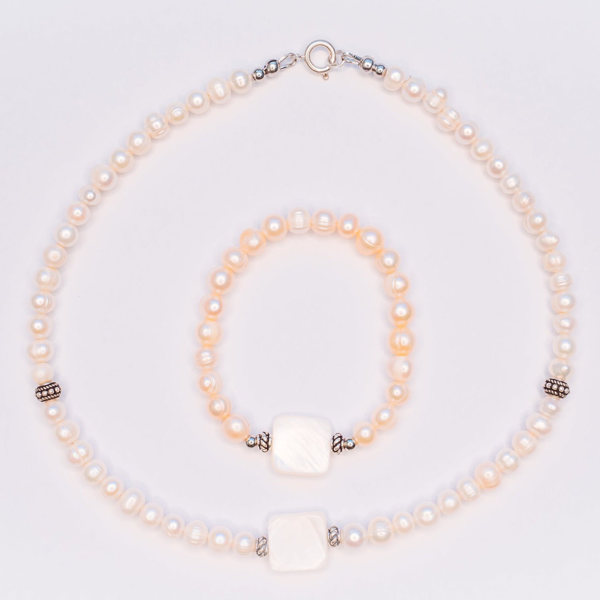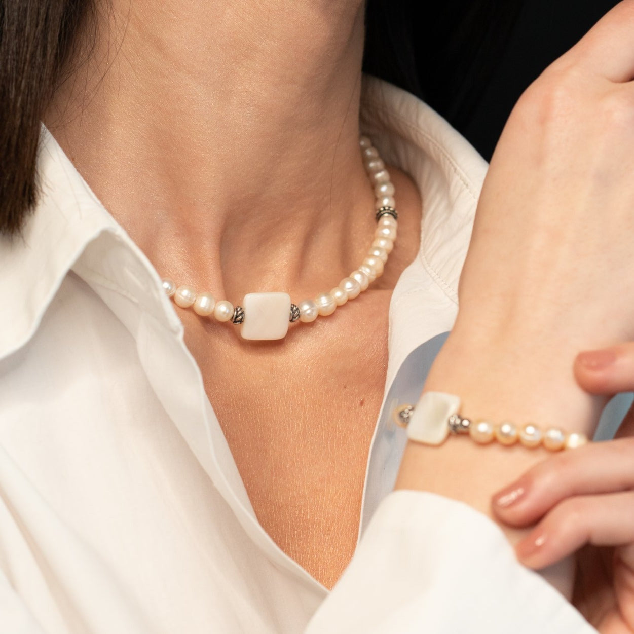Setul de bijuterii din perle de cultură și perlă de sidef este o alegere elegantă pentru a-ți completa orice ținută. Setul conține o brățară și un colier confecționate din perle rotunde și mici, cu un fermecător pandantiv de sidef.