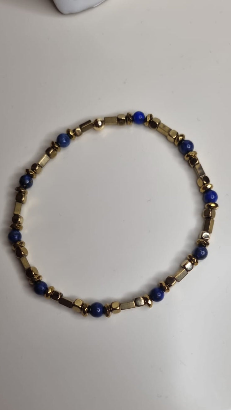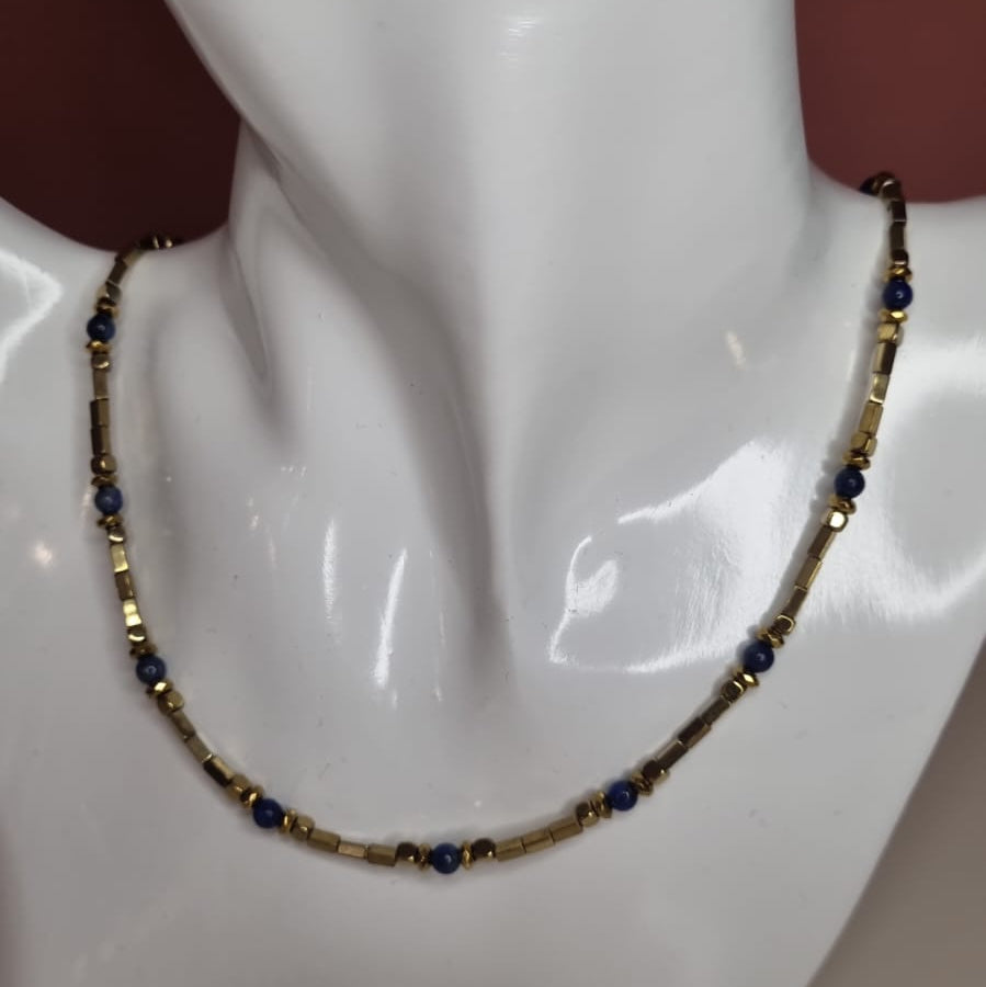 Acest colier este realizat cu hematite placate auriu si margele de sodalit ofera un aspect strălucitor și un aspect deosebit.